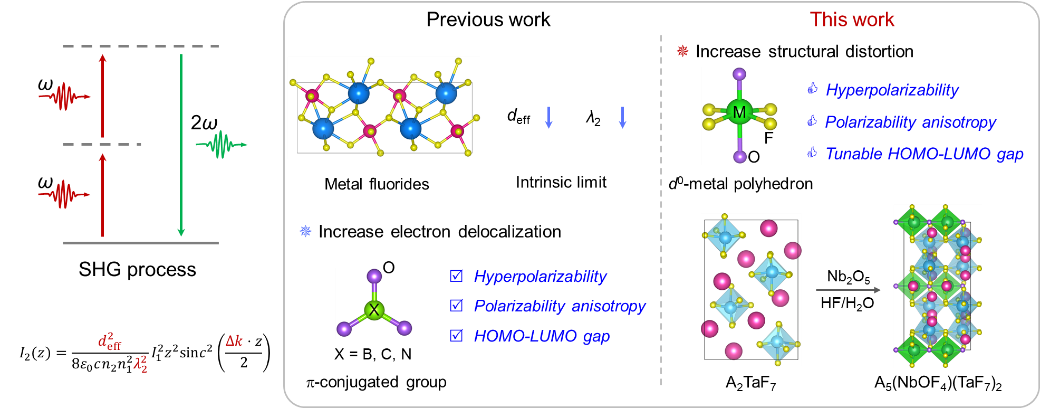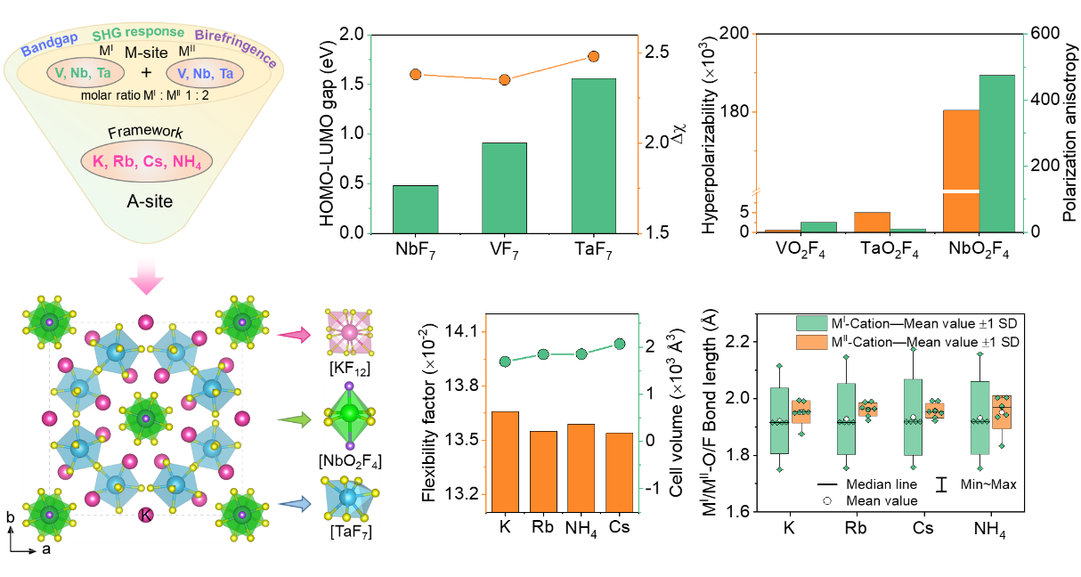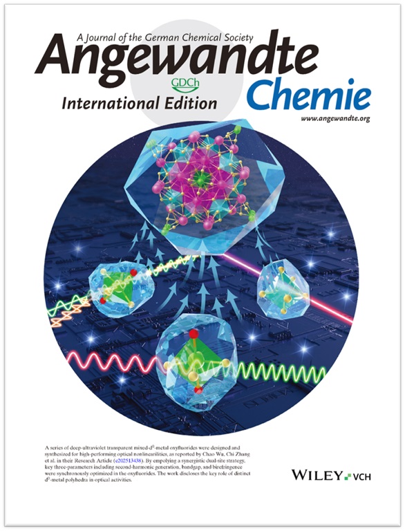 近日,欧洲科学院院士、德国国家工程院院士、永利官网张弛教授研究团队在混合d0过渡金属二阶非线性光学晶体材料研究中再获重要进展,实现了二阶非线性光学晶体材料深紫外透明度/非线性光学性能权衡的新突破。公司化学科学与工程研究团队与中科院北京理化技术研究所和澳大利亚国立大学等单位研究团队紧密合作,利用第一性原理计算对过渡金属氟化基元进行筛选,采用协同双位点策略,合成了首例深紫外透过且能够通过四次谐波产生输出266 nm倍频光的混合d0过渡金属材料A5(NbOF4)(TaF7)2 (A = K, Rb, Cs, NH4),探讨并阐明了受控氟化基元对晶体材料光学性能的调控机制。相关成果“Breaking the Deep-UV Transparency/Optical Nonlinearity Trade-Off: Three-Parameter Optimization in Oxyfluorides by Tailoring d0-Metal Incorporation” (打破深紫外透明度/非线性光学的权衡:通过调控d0金属掺入优化氧氟化物的三个参数)日前以全文(Research Article)的形式发表于国际化学、材料顶级权威学术期刊《德国应用化学》(Angewandte Chemie International Edition, 2025, 64, e202513438),并被编辑委员会遴选推荐为当期的封面文章(Inside Front Cover)和热点论文(HOT Paper)。