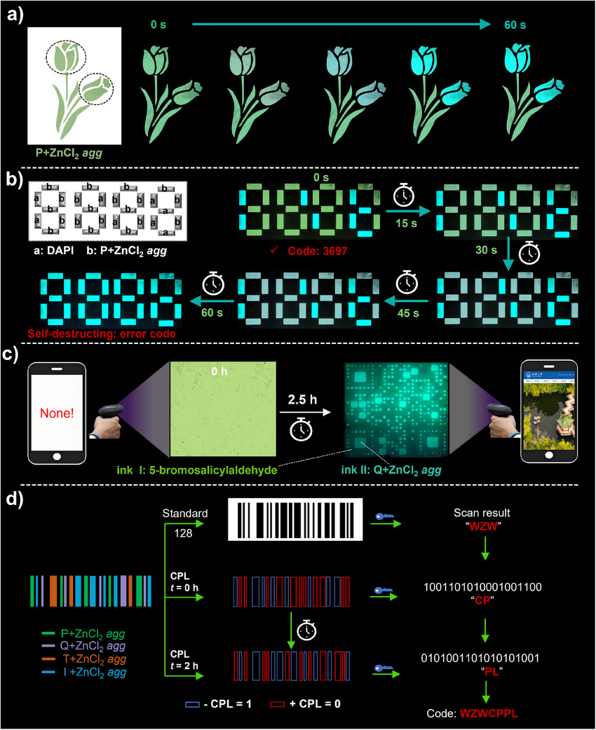 基于这种时间与温度依赖的CPL响应特性,该体系在固态光信息加密材料方面展现出显著的应用潜力。研究团队进一步利用该配位超分子聚合物所呈现的时间/温度调控的荧光颜色变化及CPL信号反转行为,成功构建了多层级、动态可调的信息加密模型,充分展示了其在高安全性信息存储与防伪领域的广阔应用前景。