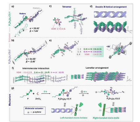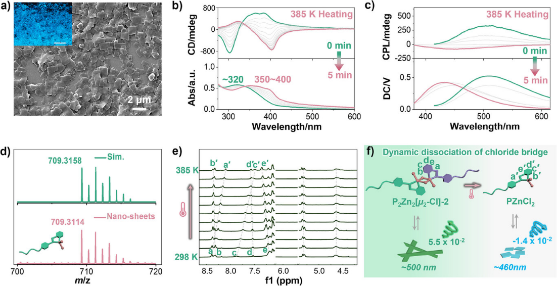 此外,合作研究团队利用氯桥键的温敏响应特性,通过质谱分析和单晶X射线衍射证实:在385 K下加热5分钟后,加热可触发氯桥的动态解离,导致结构从P₂Zn₂(μ₂-Cl)-2转变为PZnCl₂,并引发超分子聚合物中分子堆积方式的重组,实现配合物的动态结构转换。具体而言,原本由P₂Zn₂(μ₂-Cl)-2组装形成的微带结构转变为纳米片形貌,荧光颜色由青色变为蓝色,同时伴随圆二色(CD)和圆偏振发光(CPL)信号的二次反转,展现出温度驱动的多级手性与发光协同调控能力。