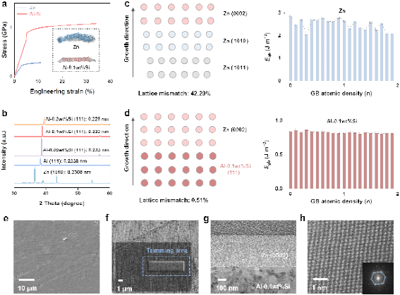 Al-0.1wt%Si (111)和生长的Zn(0002)平面之间可忽略的晶格间距偏差(0.2320 vs.0.2308 nm),使得铝硅基体与Zn (0002)晶面仅有0.51%的晶格失配,实现了成核锌原子的有序排列和稳定的Zn (0002)面外延生长,这种致密的晶粒堆叠方式将晶界处内应力显著降低至0.22 MPa(商业锌箔为7.29 MPa)。