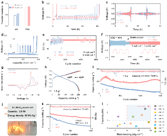 电化学性能测试表明,零应力锌负极提升了锌离子在电极/电解液界面的沉积/剥离效率,Zn||Cu电池在5 mA cm−2下循环6000次平均库仑效率达99.83%,Zn||Zn电池实现8000 h稳定电沉积/剥离。Zn||MnO2软包电池1000次循环保持率为72.25%。