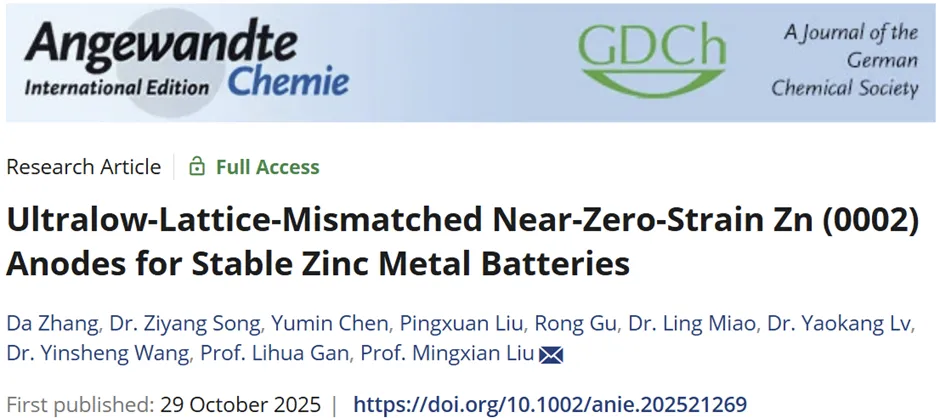 公司刘明贤教授团队长期致力于高效储能材料研究并应用于新能源电池,在设计新型亲质子羰基聚合物(Angew. Chem. Int. Ed., 2025, 64, e202423936)、低氧化还原势垒双电子p型有机材料(Angew. Chem. Int. Ed., 2025, 64, e202501278)、多氮杂环给体-受体自组装有机超结构(Angew. Chem. Int. Ed., 2025, 64, e202418237)、多重氢键自组装超结构(Energy Environ. Sci., 2025, 18, 5397–5406)、高转化效率和稳定六电子碘转化设计(Energy Environ. Sci., 2025, 18, 6540–6547)等方面取得了一系列重要研究成果。在研究团队前期单一Zn (0002)晶面暴露(Angew. Chem. Int. Ed., 2025, 64, e202414116, Hot Paper)和低应力介导Zn (0002)晶面暴露(Angew. Chem. Int. Ed., 2025, 64, e202500380)研究基础上,近期设计了一种超低晶格失配的铝硅合金基底(Al-0.1wt%Si),制备出近乎零应力的锌金属负极,实现了锌金属电池的高度可逆性和稳定性,研究成果以"Ultralow-Lattice-Mismatched Near-Zero-Strain Zn (0002) Anodes for Stable Zinc Metal Batteries"为题发表于国际化学领域权威期刊《德国应用化学》(Angewandte Chemie International Edition),并被编辑遴选为热点论文(Hot Paper)。