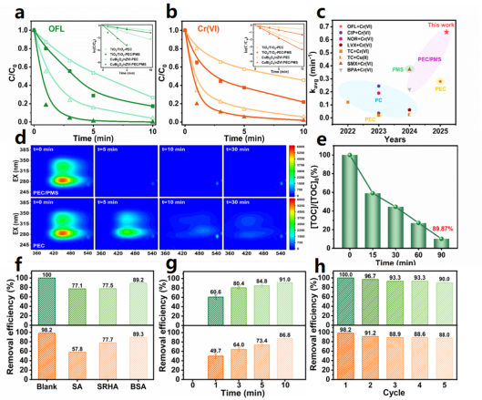 CuBi2O4/nZVI-PEC/PMS体系展现出快速的氧化还原动力学,在10分钟内实现OFL(k=0.994 min-1)和Cr(VI)(k=0.325 min-1)的近乎完全去除。在实际水体中表现出良好的适应性,循环使用五次后活性保持在90%左右,证实该体系具有良好的实际应用前景。这项工作为水环境中复合污染物的高效同步去除提供了重要的思路。