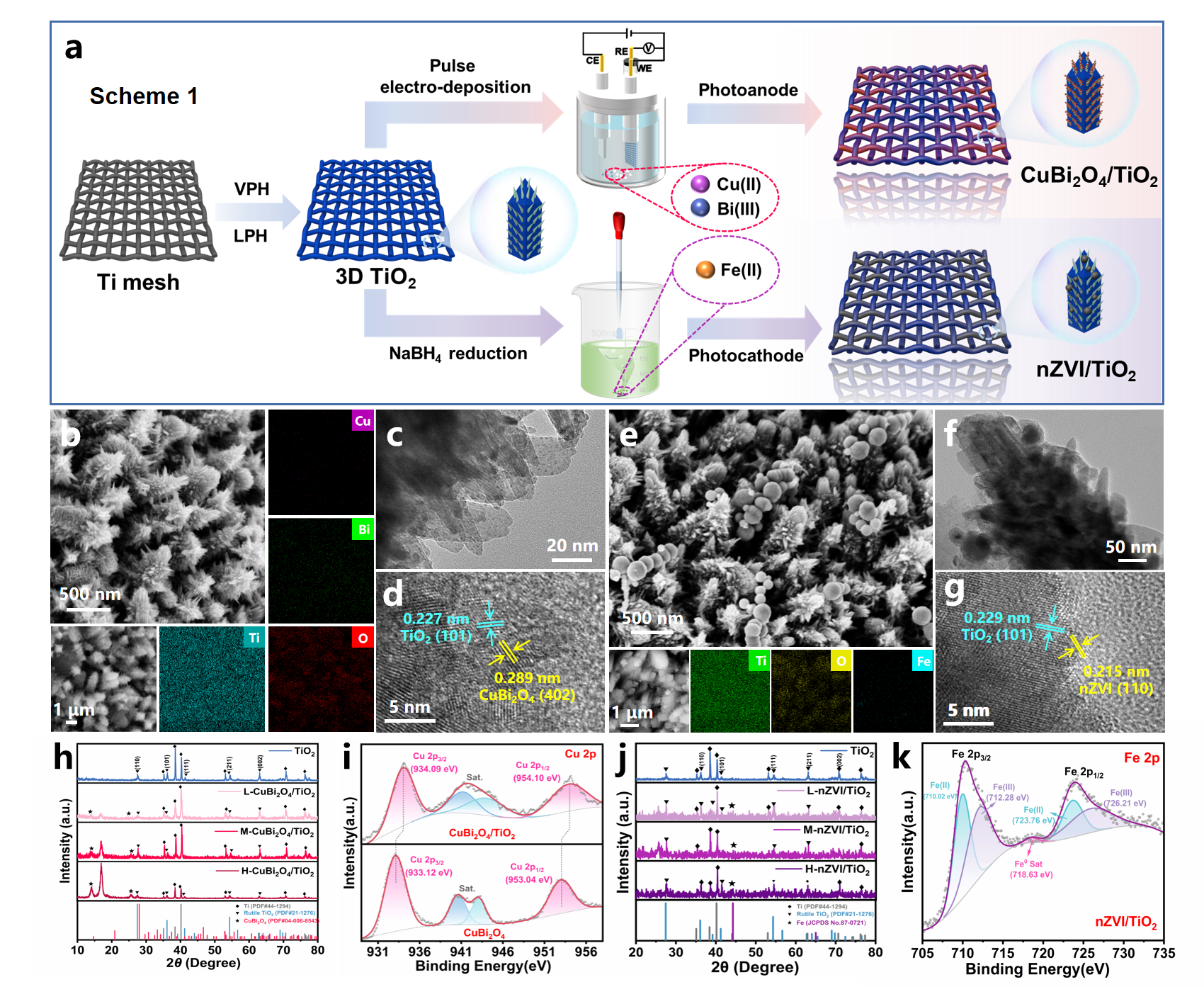 采用脉冲电沉积法和硼氢化钠还原法分别制备了CuBi2O4/TiO2光阳极和nZVI/TiO2光阴极。SEM表征结果显示CuBi2O4/TiO2光阳极和nZVI/TiO2光阴极均保留了TiO2基底高度有序的三维树状阵列结构。TEM及HRTEM证实了CuBi2O4与nZVI纳米材料在TiO2表面的均匀负载,且清晰的晶格条纹表明材料间形成了紧密的异质界面。