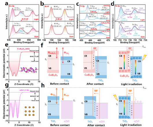 结合原位XPS技术与DFT理论计算,深入解析了电极界面的电荷转移机制。结果证实,光照下元素的结合能发生显著位移,表明电子在界面间发生了定向转移。进一步的能带分析确证了CuBi2O4/TiO2界面S型异质结与nZVI/TiO2界面欧姆接触的形成。这种独特的双结结构诱导了内建电场,有效促进了光生载流子的分离与传输,并保留了具有强氧化还原能力的电子和空穴。