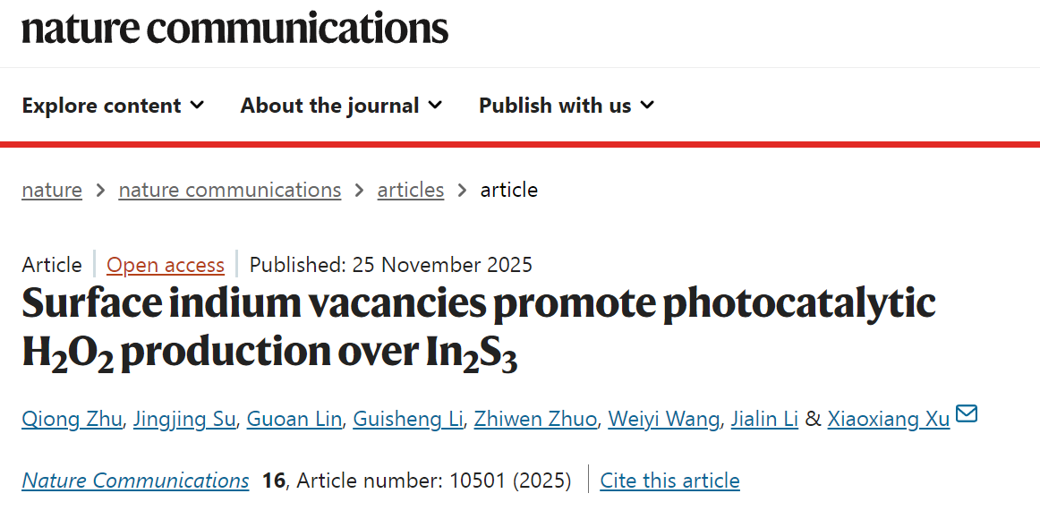 光催化氧还原反应(ORR)是一种绿色、经济的过氧化氢(H2O2)制备方法。金属硫化物In2S3因其合适的能带结构和优异的可见光吸收在ORR制备H2O2方面具有前景。然而In2S3光催化合成H2O2效率通常不佳,主要归因于材料中光生载流子的快速衰减以及表面催化位点缺失。例如,In2S3表面缺乏O2分子吸附位点并且容易诱导产物H2O2 发生歧化反应。永利官网徐晓翔教授课题组发展了表面阳离子空位策略改性In2S3,实现可见光驱动的高效光催化合成H2O2,相关成果近日以“Surface indium vacancies promote photocatalytic H2O2 production over In2S3”为题发表在《自然·通讯》(Nature Communications)。