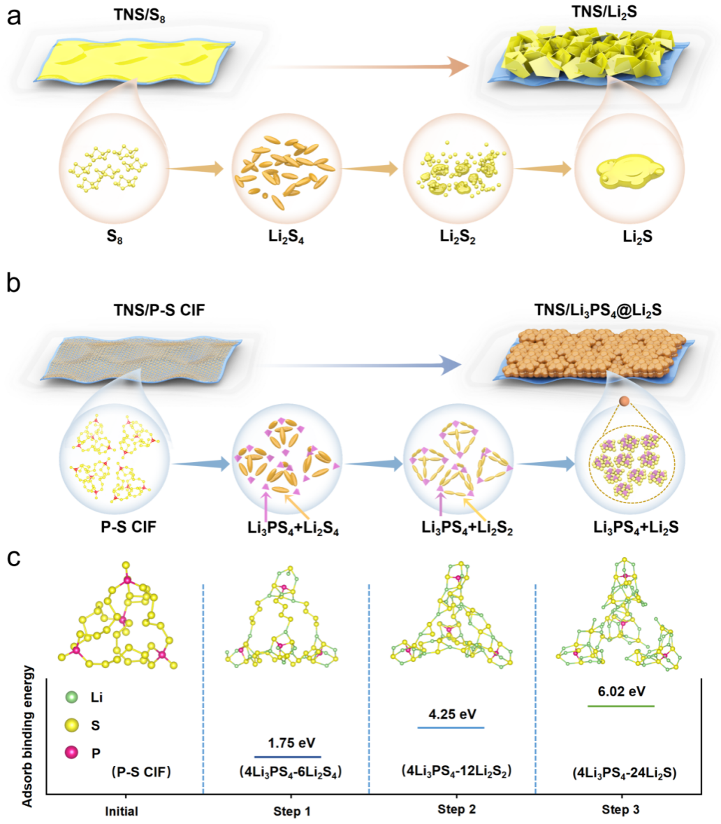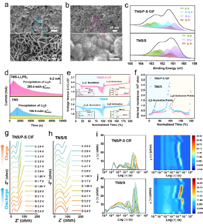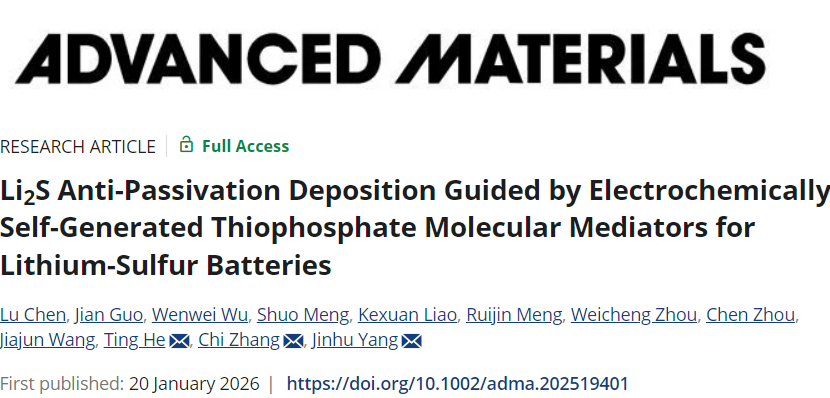 锂硫电池因其超高理论能量密度(约2600 Wh kg⁻¹)和硫元素的资源优势,被认为是下一代高能量密度储能体系的重要候选。然而在实际应用中,由于可溶性多硫化物的穿梭效应会以及最终放电产物 Li2S 的钝化问题,其性能始终难以突破。针对上述问题,公司贺婷/杨金虎教授课题组联合张弛院士团队,提出了一种全新的解决思路:通过电化学过程原位生成分子级介体Li3PS4分子,引导Li2S以高活性结构沉积形成由Li3PS4@Li2S分子簇构成的三维多孔沉积膜,从根本上避免钝化。相关成果以“Li2S Anti-Passivation Deposition Guided by Electrochemically Self-Generated Thiophosphate Molecular Mediators for Lithium-Sulfur Batteries”为题,近日在线发表于《先进材料》。
