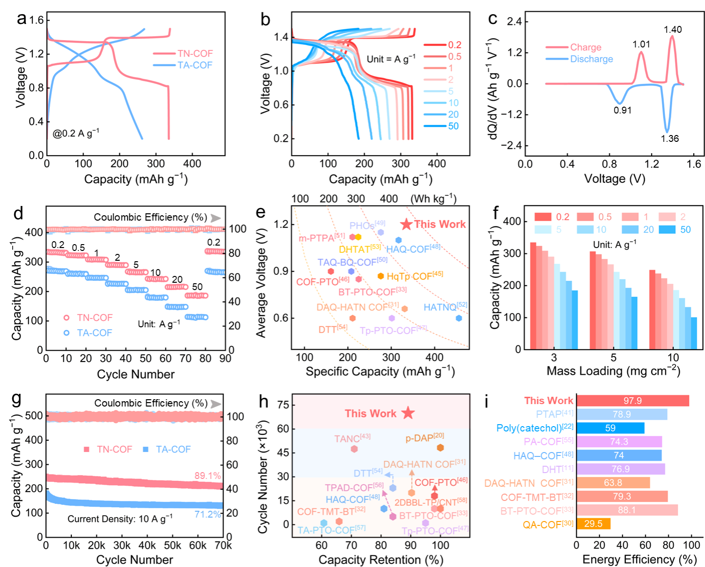 TN-COF正极材料用于锌-有机电池时,表现出高平均电压平台(1.2 V)、高比容量(335 mAh g−1)、高能量密度(402 Wh kg−1)和长循环稳定性(70,000次充放电后容量保持率为89.1%)。