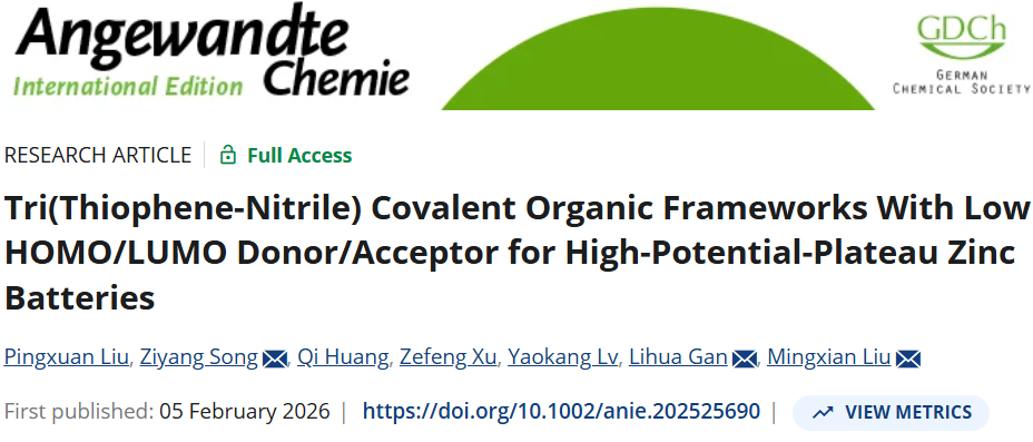 公司甘礼华教授、刘明贤教授团队长期致力于高效储能材料研究并应用于新能源电池,课题组近期设计了低HOMO/LUMO给体-受体的三噻吩-三氰基COFs正极材料,促进了低反应能垒的CF3SO3−/NH4+相反离子交替配位,揭示了p型三噻吩和n型三氰基单元的协同氧化还原电荷存储机制,有效解决了当前COFs高比容量和电压平台难以兼顾的难题,构建了高能量密度和长循环寿命的锌-有机电池。相关研究成果以Tri(Thiophene-Nitrile) Covalent Organic Frameworks With Low HOMO/LUMO Donor/Acceptor for High-Potential-Plateau Zinc Batteries为题发表于化学领域国际权威期刊《德国应用化学》(Angewandte Chemie International Edition)。