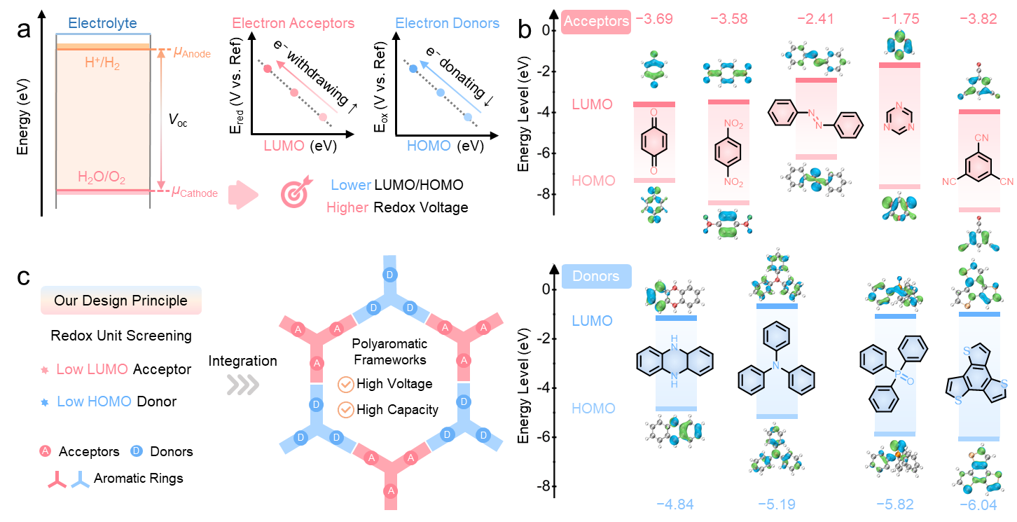 共价有机框架(Covalent Organic Frameworks, COFs)因其周期性排列的氧化还原活性位点和拓展的给体-受体共轭结构,在水系锌-有机电池正极材料中备受关注。尽管多位点活性的COFs能够提供高比容量,但其活性单元较高的前线分子轨道(HOMO/LUMO)能级,往往导致材料的氧化还原电压平台偏低(<0.8 V),从而限制了电池的能量密度。因此,亟需开发具有低HOMO/LUMO能级给体-受体的新型COFs,以同步获得高容量和高电压平台,从而进一步提升锌电池的电化学性能。