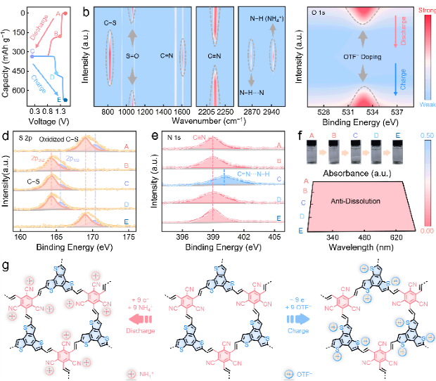 异位光谱研究表明,三噻吩/三氰基作为TN-COF正极的电活性中心,分别与CF3SO3−和NH4+电荷载体配位,引发稳定快速的18 e−电荷存储过程。这项研究工作为通过分子HOMO/LUMO能级策略设计高电压-容量有机正极材料提供了新的视角。