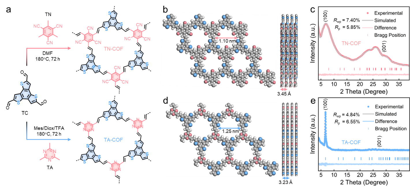 低LUMO三氰基受体与低HOMO三噻吩给体单元通过Knoevenagel缩合反应形成三噻吩-三氰基COFs(TN-COF),展示出高密度的双极性活性位点和高度共轭的结晶结构,有助于加快电子转移动力学和电极氧化还原速率。