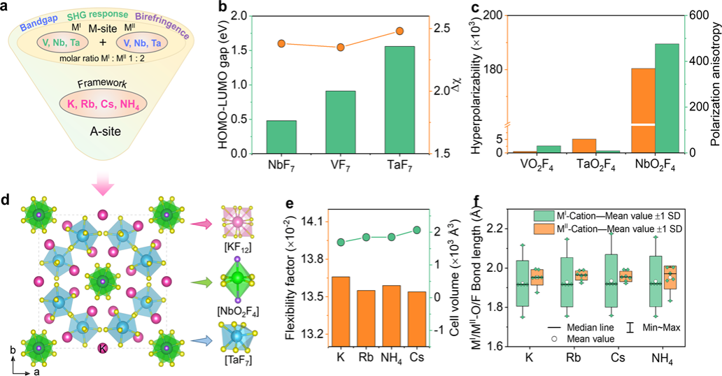 In this study, the research team systematically analyzed and screened a series of fluorinated d0 transition metal elements based on first principles calculations, and adopted a two-step synthesis method that is different from the traditional one-step synthesis method. Firstly, the precursor of d0 transition metal fluoride A2[TaF7] was synthesized, and then further reacted with another d0 transition metal oxide Nb2O5 to successfully synthesize the optimal element combination A5(NbOF4)(TaF7)2, achieving synergistic enhancement of niobium tantalum oxyfluoride crystal materials in three key optical properties. Among them, the partially fluorinated [NbO2F4] element exhibits high micro polarization and significant polarization anisotropy, while the fully fluorinated [TaF7] element shows a larger HOMO-LUMO bandgap. The [NbO2F4] octahedron, as a nonlinear optical functional element, is connected through angle sharing to form a one-dimensional chain structure, thereby achieving effective superposition of microscopic polarizability; The fully fluorinated [TaF7] element is assembled with A-site cations to form a three-dimensional framework structure, and its high transparency in the ultraviolet band ensures the wide bandgap advantage of the system. In order to further investigate the influence of F/O coordination regulation on the optical properties of [NbO2F4] and [TaF7] elements at the atomic scale, the research team conducted density of states calculations and crystal orbital Hamiltonian population (COHP) analysis. The analysis and calculation results of crystal orbitals indicate that the participation of F 2p orbitals weakens the (d-p) π conjugation between metal d orbitals (dxz, dyz, dxy) and ligand p orbitals, increases the energy of π orbitals, and reduces the π* energy level. This electronic structural change effectively reduces the electron density of the anti-bonding HOMO energy level, improves the optoelectronic properties of the material, and for the first time reveals a new mechanism for designing deep ultraviolet nonlinear optical materials.