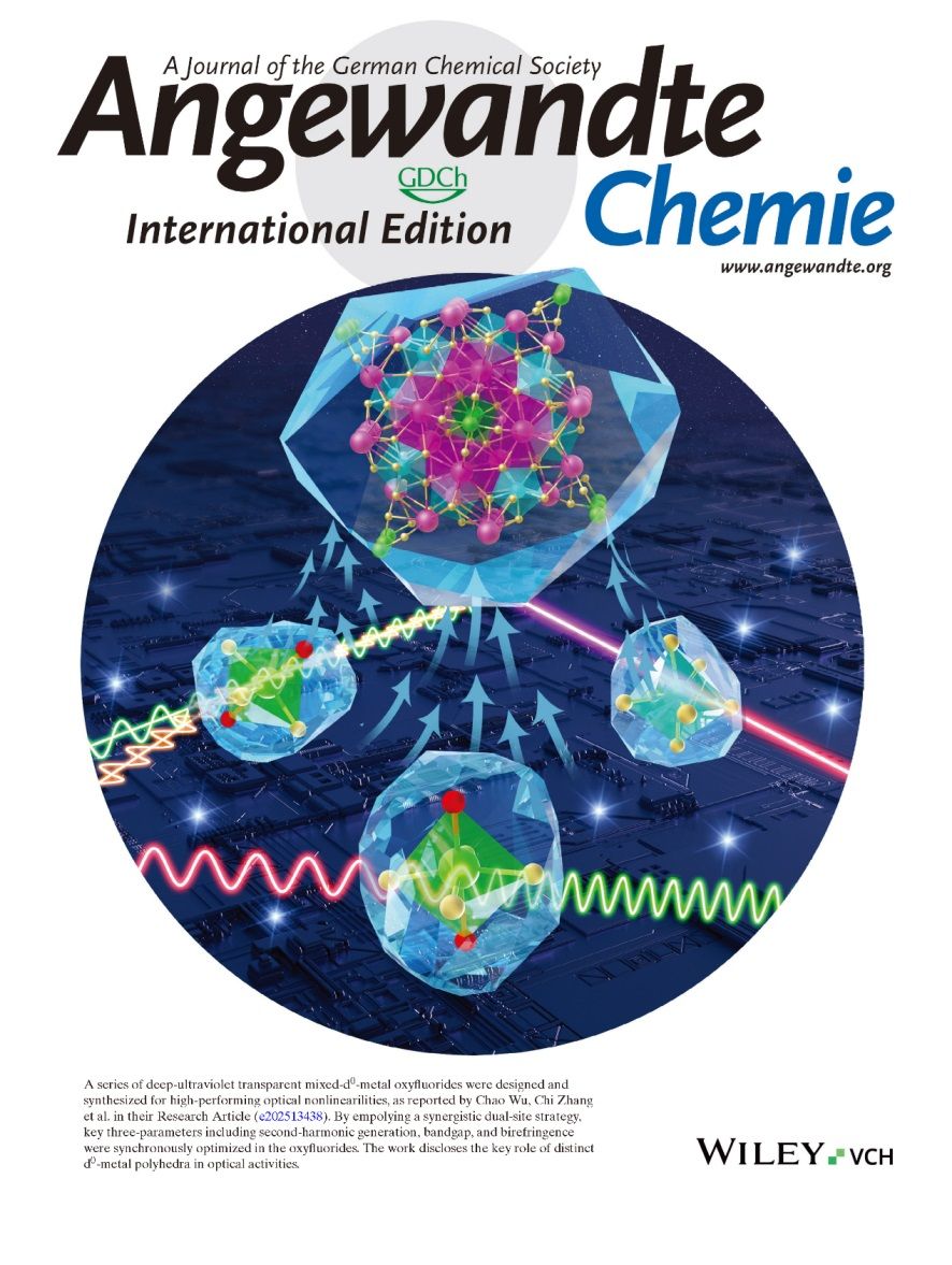 Recently, the research team led by Professor Zhang Chi, a member of the European Academy of Sciences, the German National Academy of Engineering, and the School of Chemical Science and Engineering at Tongji University, has made significant progress in the study of mixed d0 transition metal second-order nonlinear optical crystal materials, achieving a new breakthrough in the trade-off between deep ultraviolet transparency and nonlinear optical performance of second-order nonlinear optical crystal materials. The research team from the School of Chemical Science and Engineering at Tongji University, in close collaboration with the Beijing Institute of Physical and Chemical Technology of the Chinese Academy of Sciences and the Australian National University, used first principles calculations to screen transition metal fluorine-containing elements. By adopting a synergistic dual site strategy, they synthesized the first deep ultraviolet transparent and 266 nm harmonic generation hybrid d0 transition metal material A5(NbOF4)(TaF7)2 (A=K, Rb, Cs, NH4), and explored and elucidated the regulatory mechanism of controlled fluorine-containing elements on the optical properties of crystal materials. The related research results, titled "Breaking the Deep UV Transparency/Optical Nonlinear Trade Off: Three Parameter Optimization in Oxyfluorides by Tailoring d0 Metal Incorporations", were recently published in full text (Research Article) in the top international academic journal of chemistry and materials, Angewandte Chemie International Edition, and were selected and recommended by the editorial committee as the cover article (Inside Front Cover) and hot paper (HOT Paper) of the current issue.