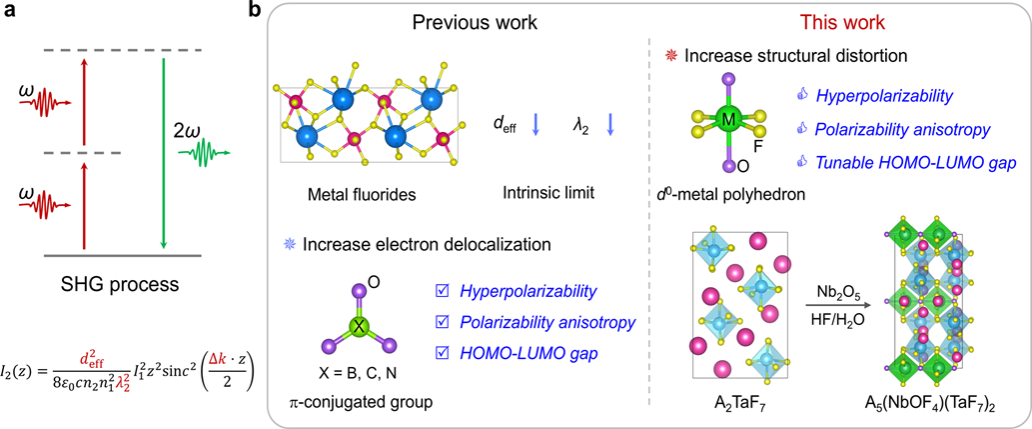 Nonlinear optical (NLO) crystals, known for their unique frequency conversion capabilities, are critical optical materials for obtaining ultraviolet (UV) and deep-ultraviolet (DUV) laser sources. They hold significant practical importance in modern high-tech fields such as national defense, semiconductor lithography, photonic communications, precision medicine, and additive manufacturing. Currently commercialized representative UV NLO crystals include β-BaB2O4 (BBO), LiB3O5 (LBO), and BaMgF4. However, high-performance DUV NLO crystals remain scarce. Due to the interdependent requirements of the three key optical properties of crystal materials, namely UV absorption cutoff edge, frequency doubling response, and birefringence, on the microstructure of crystals, designing and preparing nonlinear optical crystals that can achieve efficient UV and even DUV light output is an important scientific challenge and enormous challenge faced by researchers in related fields.